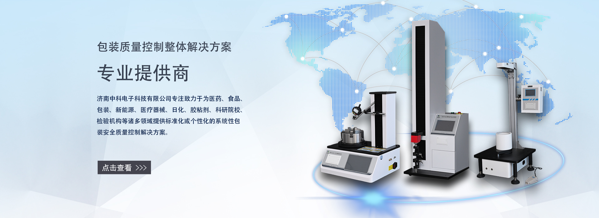 濟南中科電子科技有限公司是一家集包裝及膜材檢測儀器的研發(fā)、制造、銷售和服務為一體的專業(yè)科技公司。專注致力于為食品、醫(yī)藥、包裝、新能源、醫(yī)療器械、石化、日化、膠粘劑、科研院校、檢驗機構(gòu)等諸多領(lǐng)域提供標準化或個性化的系統(tǒng)性包裝及膜材質(zhì)量控制解決方案。